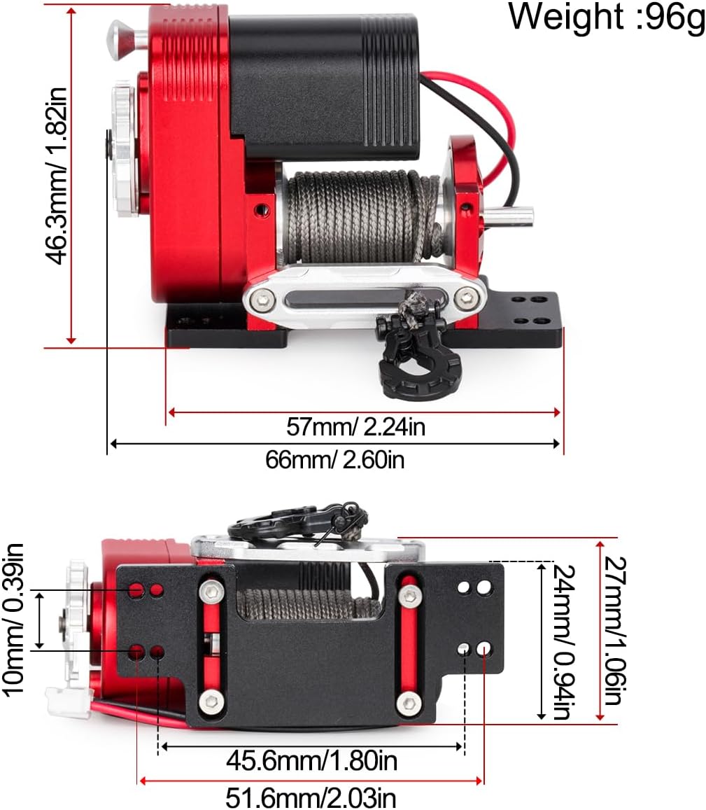 Specifications: Material: Aluminum Rated Voltage: 6V (Operating Voltage 6V-12.4V) Rope Length: 1.0mm/3.94ft (Pre-installed) Load Limit (Static): 50 lbs / 22.68 kg Load Limit (Rolling Resistance): 70 lbs / 31.75 kg Winch Rope Load Limit (Static Lift): 25 lbs / 11.34 kg Winch Rope Load Limit (Rolling Resistance): 37 lbs / 16.78 kg Dimensions: 66.0mm (L) x 27.0mm (W) x 46.3mm (H) Weight: 96g / 3.39oz Package List:1*1/10 Winch Note: This is a simulated winch for 1/10 scale RC cars, not a winch for real vehicles
