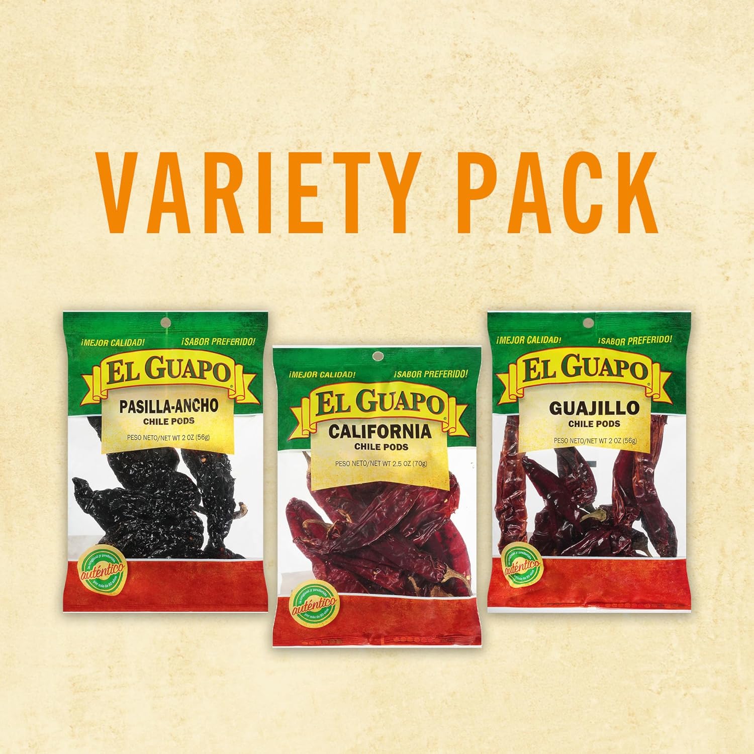 Recreate the flavors of home with the El Guapo® Chile Variety Pack. It includes three different kinds of chiles – guajillo, pasilla ancho, and California, to help deliver authentic flavor to beloved Mexican dishes and more. Bundle includes: (2) Whole Guajillo Chili Pods (Chile Guajillo Entero), 2 oz: Mild, dried, smoky-sweet chile for adding unique flavor to Mexican dishes. (2) Whole Pasilla Ancho Chili Pods (Chile Pasilla Ancho), 2 oz: Dried red chile with smoky-sweet flavor and mild to medium heat for tamales and mole. (2) Whole California Chili Pods (Chile California Entero), 2.5 oz: Mild, dried red chile with sweet bell pepper flavor used to make red chile sauce for tamales or shredded pork for tacos. Born in Los Angeles, the mecca of Mexican American cuisine, we are passionate about food and understand flavor is deeply rooted in our heritage. El Guapo, offers a wide range of high-quality products ranging from dried chili peppers to corn husks and spices. Our goal is to share our love with family and loved ones by delivering the most authentic ingredients to help you recreate the flavors of “home”.