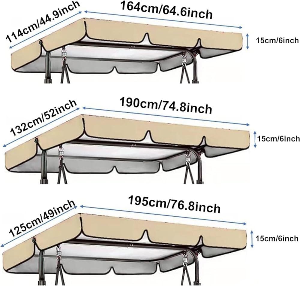 Outdoor Swing Replacement Canopy Cover & Swing Cushion Cover 2/3 Seater, Waterproof Garden Seater Sun Shade Porch Hammock Patio Swing Cover❤❤❤Patio Swing Canopy Replacement Top Cover, Replacement Cover for Swing Canopy, Garden Seater Sun Shade Treasures Porch Swing Hammock Protector Furniture CoverFeatures:Effective harmful Sun ray blocking & water repellentHigh-quality and durable 210D Oxford cloth.Durable reinforced corners.Additional graceful scalloped edge.Specification:- Name: Replacement Canopy for Swing Seat and Swing Cushion Cover- Material: Waterproof 210D Oxford cloth.- Color: Black, Gray, Beige, Green, Red, Brown, Blue- Size:Chair cover: 150 * 50 * 10cm/59.1 * 19.7 * 3.9 inch2-seater: 56x47x7inch/142x120x18cm3-seater: 65x45x6inch/164x114x15cm3-seater: 75x52x6inch/190x132x15cm3-seater: 77x49x6inch/195x125x15cm3-seater: 98x73x7inch/249x185x18cmPacking list:1 x Replacement Canopy Top Cover1 x Swing Cushion CoverNote :1.Due to manual measurement, please allow a difference of 1-3 cm.2.Due to different conditions of light and screen, the color of the product may be slightly different from the picture.
